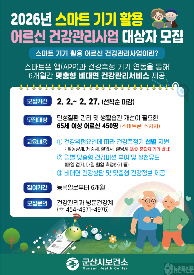 [군산=뉴전북] 군산시보건소가 오는 2일부터 스마트 기기 활용 어르신 건강관리사업 참여자 450명을 선착순 모집한다.