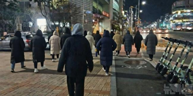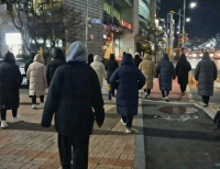 AI로 생성한 이미지. 군산시 롯데마트 거리를 많은 사람들이 롱패딩 차림으로 거닐고 있다.