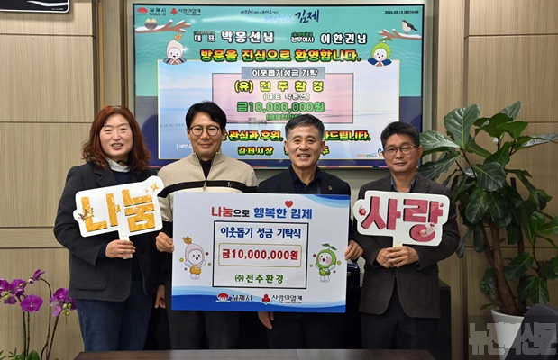 [김제=뉴전북]김제시는 ()전주환경(대표 박몽선)이 13일 저소득층을 위한 이웃돕기 성금 1,000만 원을 기탁했다고 밝혔다.