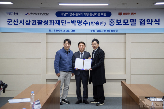 군산시상권활성화재단은 지난 23일 시청 상황실에서 군산 출신 개그맨 박명수와 공공배달앱 ‘배달의 명수’ 홍보모델 업무협약을 체결했다.[군산=뉴전북] 군산시상권활성화재단은 지난 23일 시청 상황실에서 군산 출신 개그맨 박명수와 공공배달앱 ‘배달의 명수’ 홍보모델 업무협약을 체결했다.
