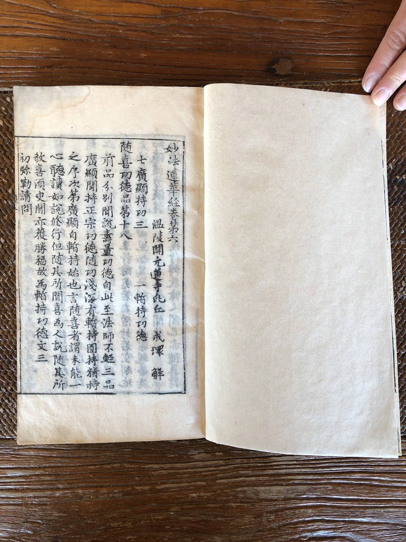 남원 선화사 소장본 묘법연화경의 권수제와 권차는 ‘妙法蓮華經卷第六(묘법연화경권제육)’으로 권6과 권7이 함께 묶여 있는 목판본 2권 1책으로 110장이며 청색 비단으로 장황돼 있다.