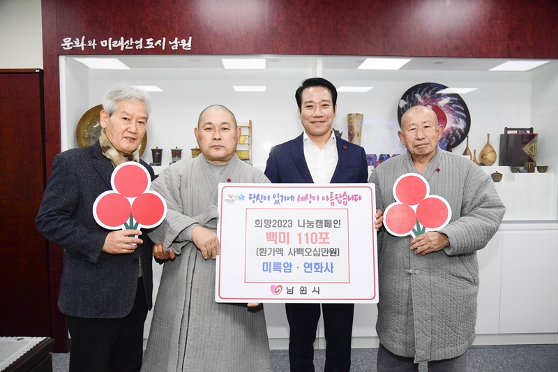 남원시는 향돈촌 영농조합법인에서 성금 5백만원, 미륵암·연화사에서 백미 110포(10kg 50포, 20kg 60포)를 기탁했다고 밝혔다.