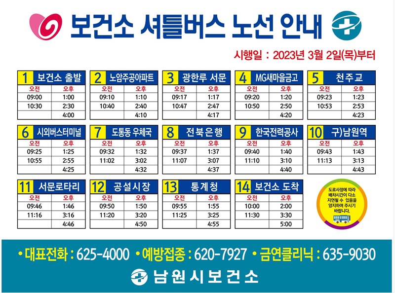 [남원=뉴전북] 남원시보건소(소장 한용재)32일부터 보건소 셔틀버스 운행 노선과 시간을 변경하여 운행한다고 밝혔다.