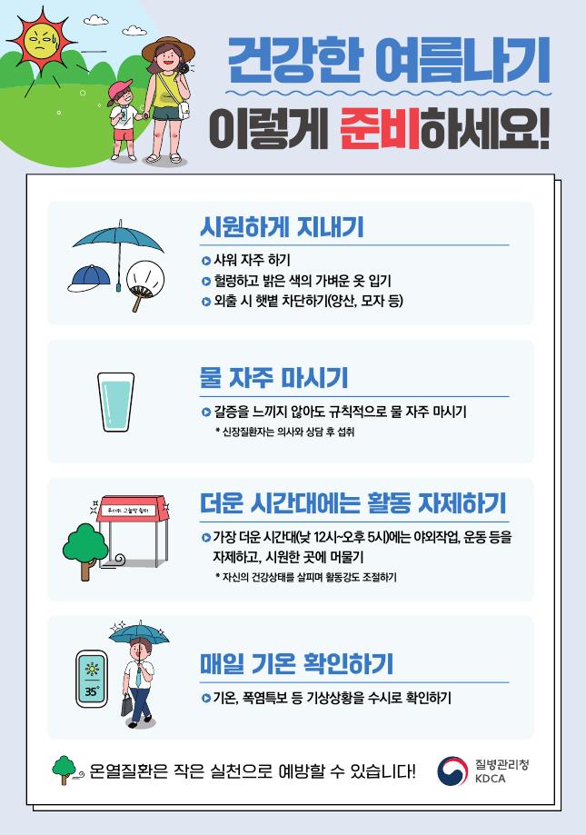 특히 폭염으로 인한 온열질환 발생 시 두통과 어지러움, 근육경련, 피로감, 의식저하 등의 증상을 보이고, 방치 시에는 생명이 위태로울 수 있다. 또, 고혈압과 당뇨병, 심·뇌혈관질환 등 만성질환이 있는 경우에는 더위로 인해 증상이 더욱 악화될 수 있으므로 각별한 주의가 요구된다.