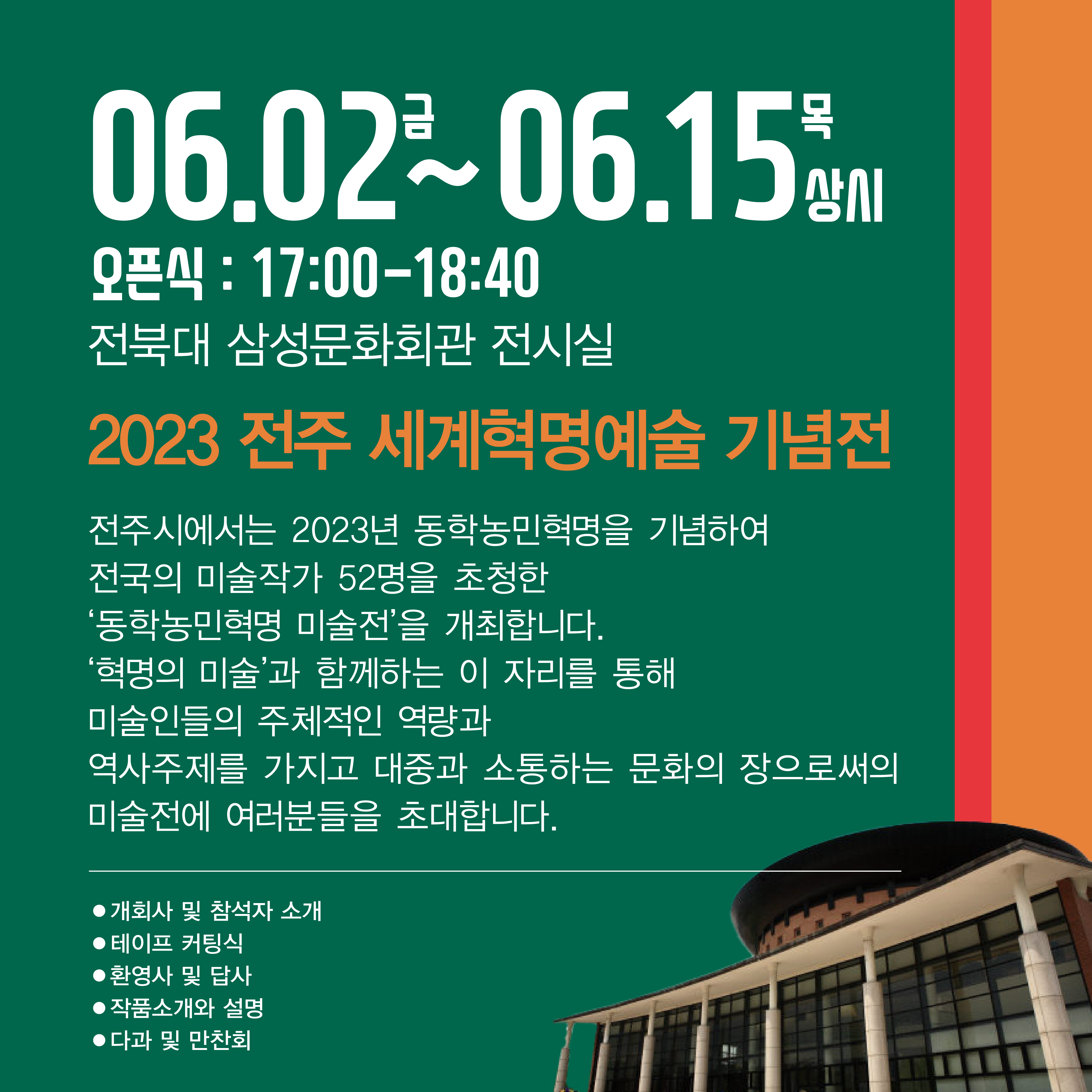 황권주 전주시 문화체육관광국장은 “오랜만에 전국에서 많은 작가님들이 참여하여 동학농민혁명을 기념하는 특별한 전시가 열렸다”면서 “동학농민혁명의 역사적 투쟁과 129년이 지난 현재 우리가 가진 시대적 과제와 혁명의 계승은 어떻게 되고 있는지 돌아볼 수 있는 전시에 많은 시민들이 함께 했으면 좋겠다”고 말했다.