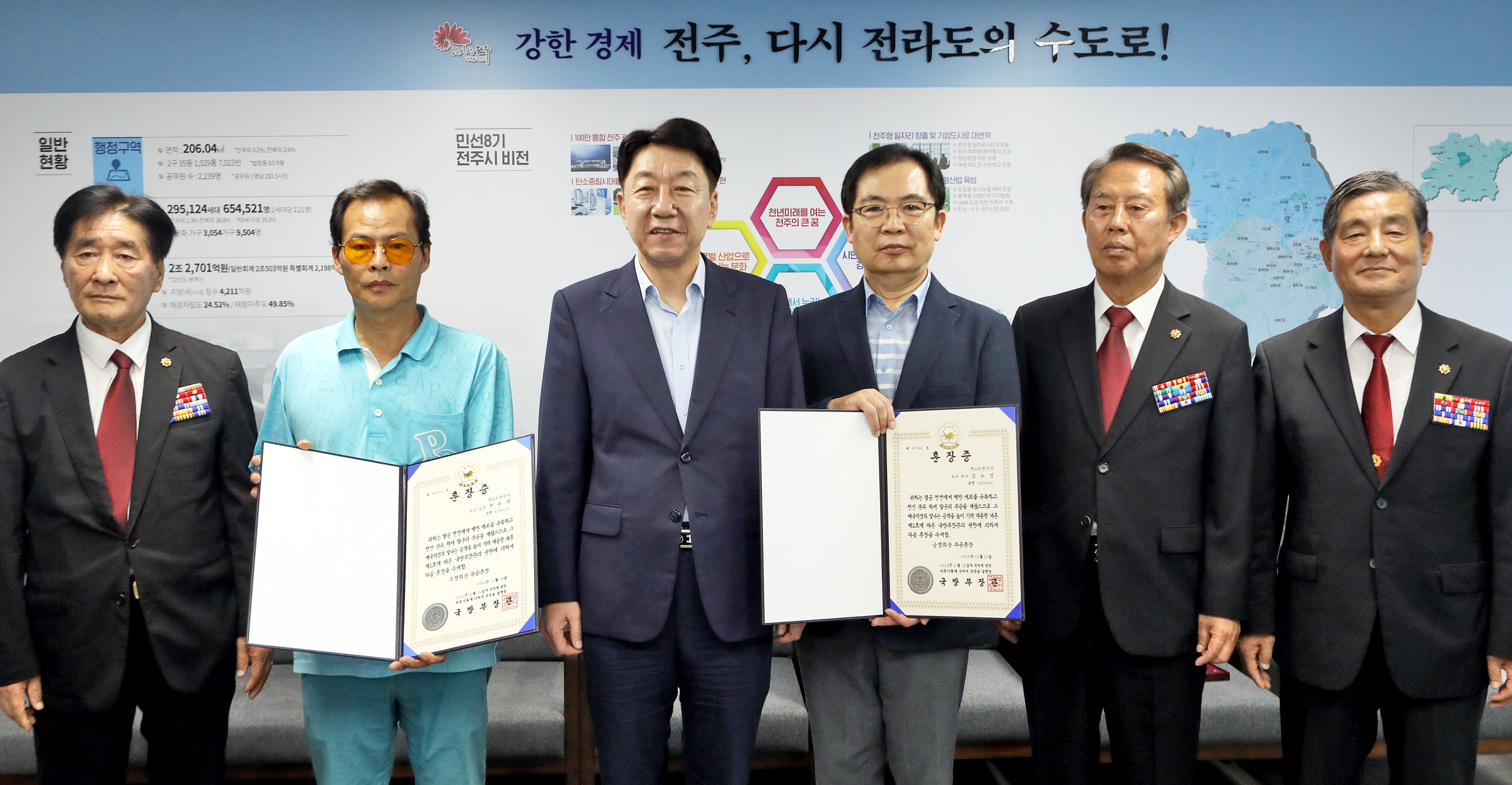 우범기 전주시장은 21일 전주시장실에서 6.25 전쟁 중 전사한 故 김노성 중사와 故 전윤권 일병의 유족에게 화랑 무공훈장을 전도 수여했다.