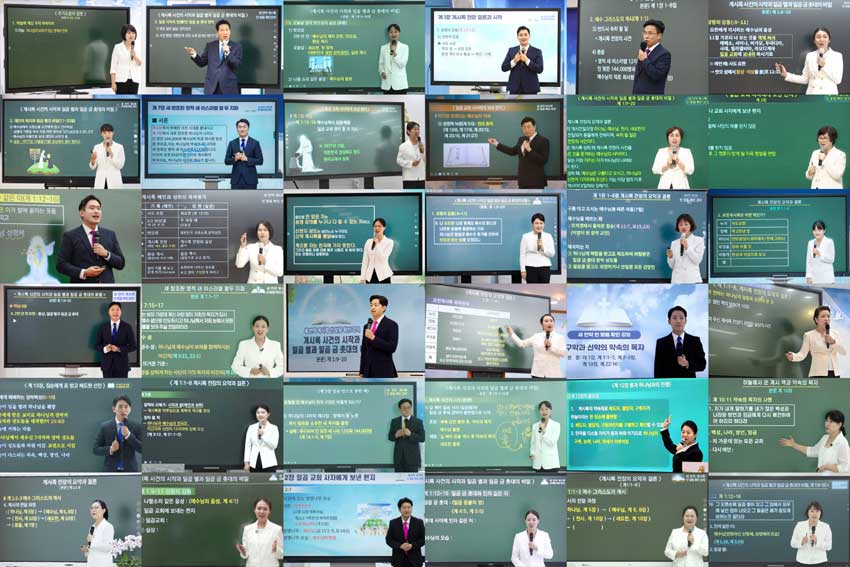 신천지예수교회 일반 성도로 수요예배에 계시록 설교를 진행하는 성도들 (사진 윗줄 왼쪽부터 시계방향으로) 통영교회 장세현 성도, 왕십리교회 정민희 양, 동대문교회 이은지 성도, 경주교회 배원영 성도의 모습 (사진 = 신천지예수교회)