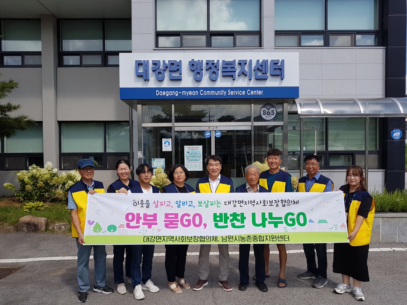 이동현 대강면장은 더운 날씨에도 불구하고 직접 가구에 방문하여 안부 확인 및 밑반찬 전달을 하느라 애써준 협의체 위원들에게 감사드린다. 앞으로도 지역 특화사업 활성화 및 지역 내 복지 문제 해결에 있어 민·관이 함께 적극적으로 앞장서겠다고 말했다.