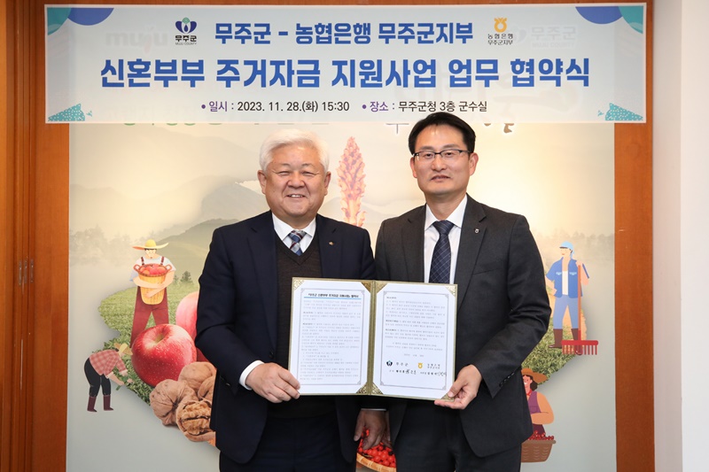 [무주=뉴전북] 무주군은 지난 28일 농협은행 무주군지부(지부장 김범석)와 신혼부부 주거자금 지원을 위한 업무협약을 체결했다고 밝혔다.