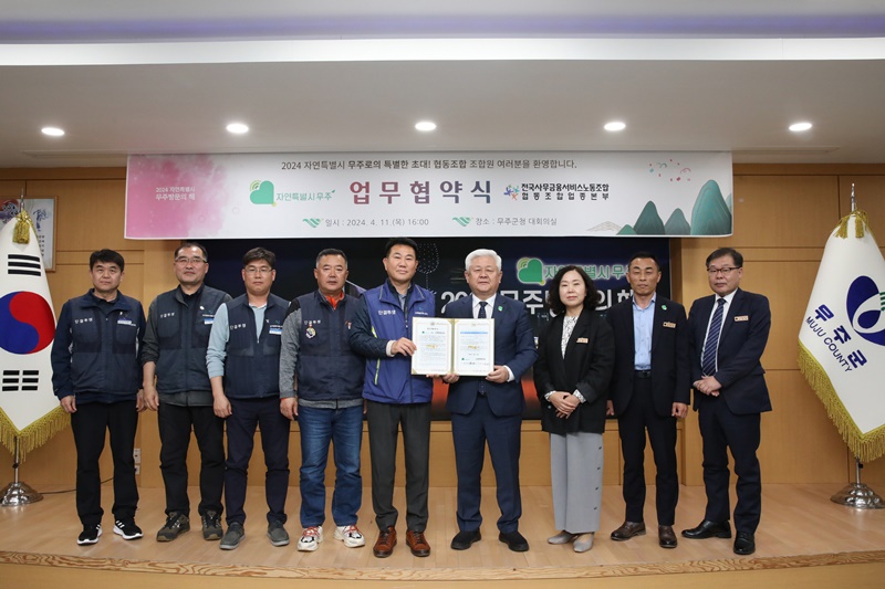 [무주=뉴전북] 무주군이 ‘2024 자연특별시 무주방문의 해’ 활성화와 방문객 유치를 위해 지난 11일 전국사무금융서비스노동조합 협동조합업종본부(이하 전국협동조합 노조)와 업무협약을 체결했다고 밝혔다.