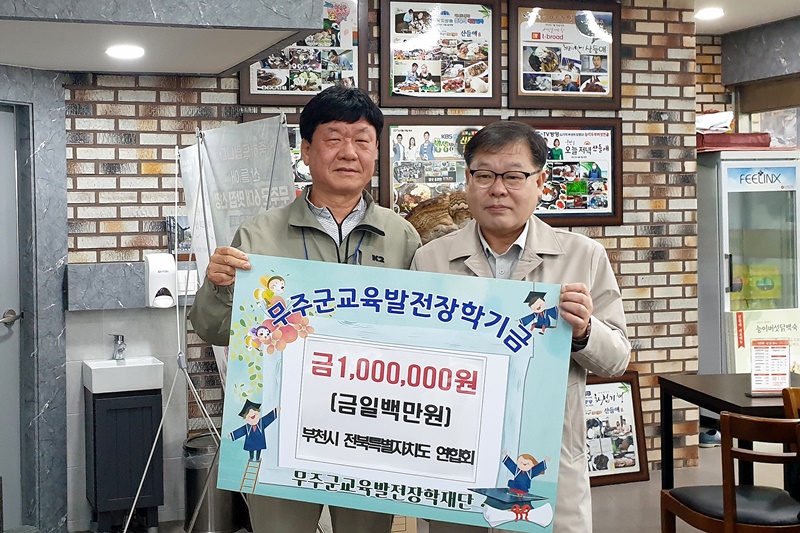 [무주=뉴전북] 자연특별시 무주방문의 해를 맞아 지난 20일 무주지역을 찾았던 부천시 전북특별자치도 단체연합회 회원들이 무주군 인재 양성에 보탬이 되고 싶다는 뜻을 밝히며 장학금 1백만 원을 기탁했다.