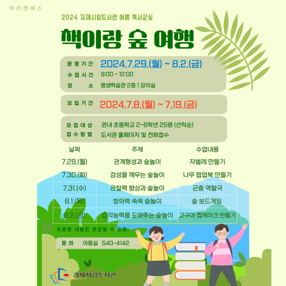정성주 김제시장은 “이번 여름 독서교실이 초등학생들에게 창의적인 사고력을 키울 수 있는 소중한 시간이 될 것으로 기대하며, 방학을 알차게 보낼 수 있도록 지원을 아끼지 않겠다.”고 전했다.