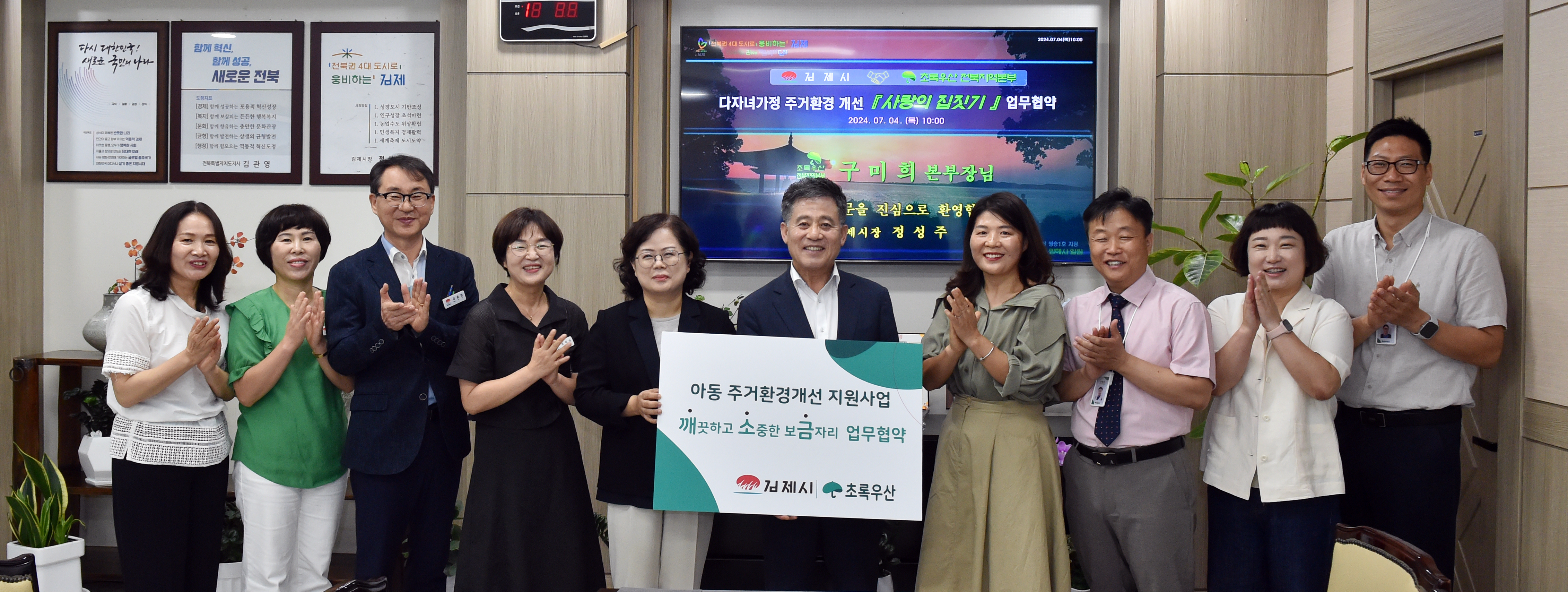 정성주 김제시장은 “어린아이들이 좁은 공간에서 생활하고 있어 마음이 아팠는데, 초록우산이 쾌적하고 아늑한 보금자리 마련에 앞장서 주셔서 감사하고, 앞으로도 다자녀가정의 주거환경개선을 위해 더욱 노력하겠다” 고 말했다.