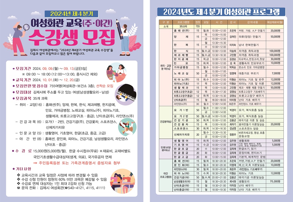 김제시에 주소를 둔 여성은 누구나 신청 가능하며 방문 접수를 통해 선착순으로 모집하고 수강료는 3개월에 15,000원으로 국민기초생활수급자(생계.의료), 국가유공자 등은 수강료가 면제된다. 이번에 모집된 수강생은 오는 10월 1일부터 3개월간 교육이 진행된다.