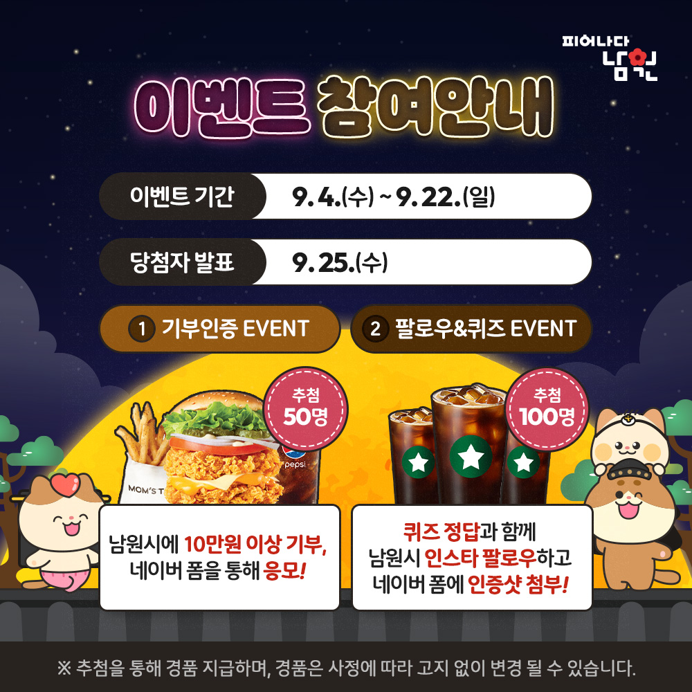 ‘둘’은, 남원시 고향사랑기부제 답례품 퀴즈 정답과 남원시 인스타 팔로우 인증샷을 네이버 폼에 응모하면 100명에게 아메리카노 커피 쿠폰을 증정해, 고향사랑기부제에 관심 있는 누구나에게 답례품도 알리고 남원시의 다양한 정보도 얻을 수 있는 인스타그램까지 홍보할 수 있어 일석이조 이벤트이며, 2종 이벤트 당첨 발표는 9월 25일경 남원시 공식 SNS 인스타그램에 게시할 예정이다.