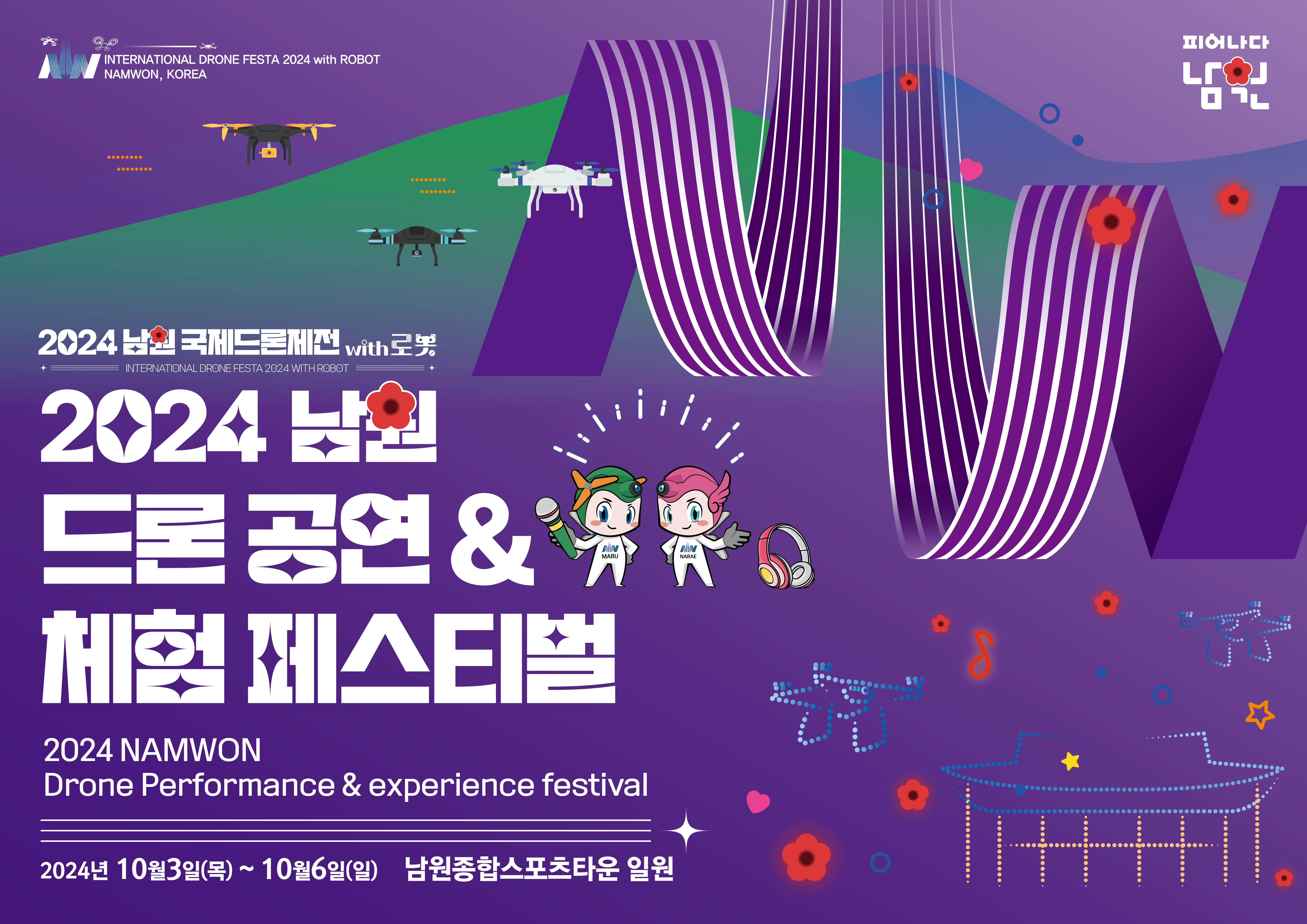 10월3일 남원 종합스포츠타운 주 경기장에서 ‘2024 남원국제드론제전 로봇’에 참여하는 선수단의 입장식이 열리며 남원시장이 VR프리젠테이션을 진행하며 개막을 선포할 예정이다. 남원시 예술단의 사전 공연 이후 SG워너비, 김태연, 엔플라잉의 개막식 축하공연이 진행된다.
