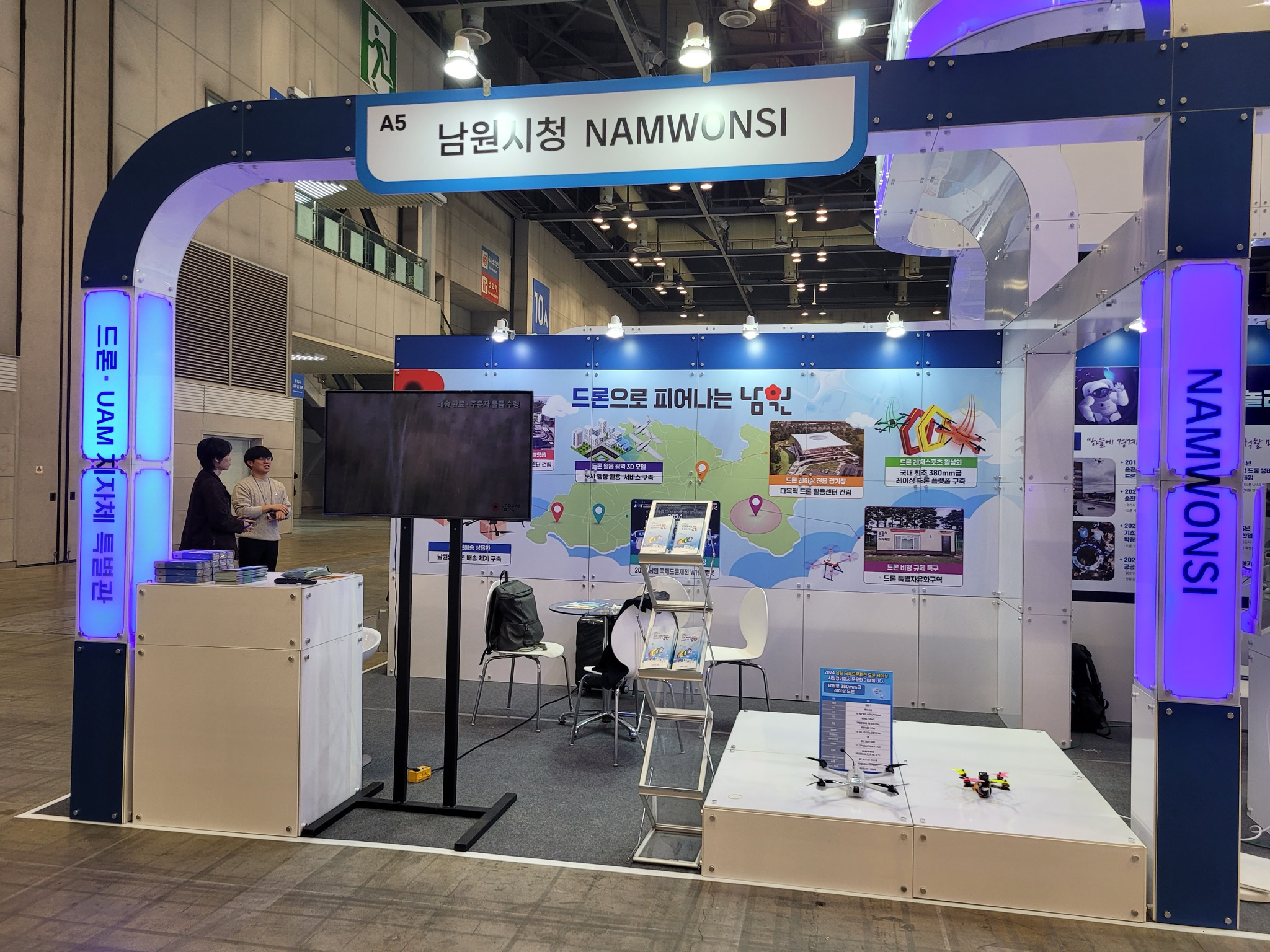 남원시 전시관에서는 드론레저스포츠 인프라 핵심시설인 다목적드론활용센터 건립 추진사항 및 2023년~2024년 2년 연속 선정된 국토교통부 2024년 드론 실증도시 구축 사업으로 추진 중인 드론 배송, 드론 레저, 공간정보 등 실증 사업, 드론업체의 기술개발 특별지구인 드론특별자유화구역 운영, 지역 청소년 및 어르신 대상 찾아가는 드론교실 사업 등 전반적인 남원시 추진사항을 홍보하게 된다.