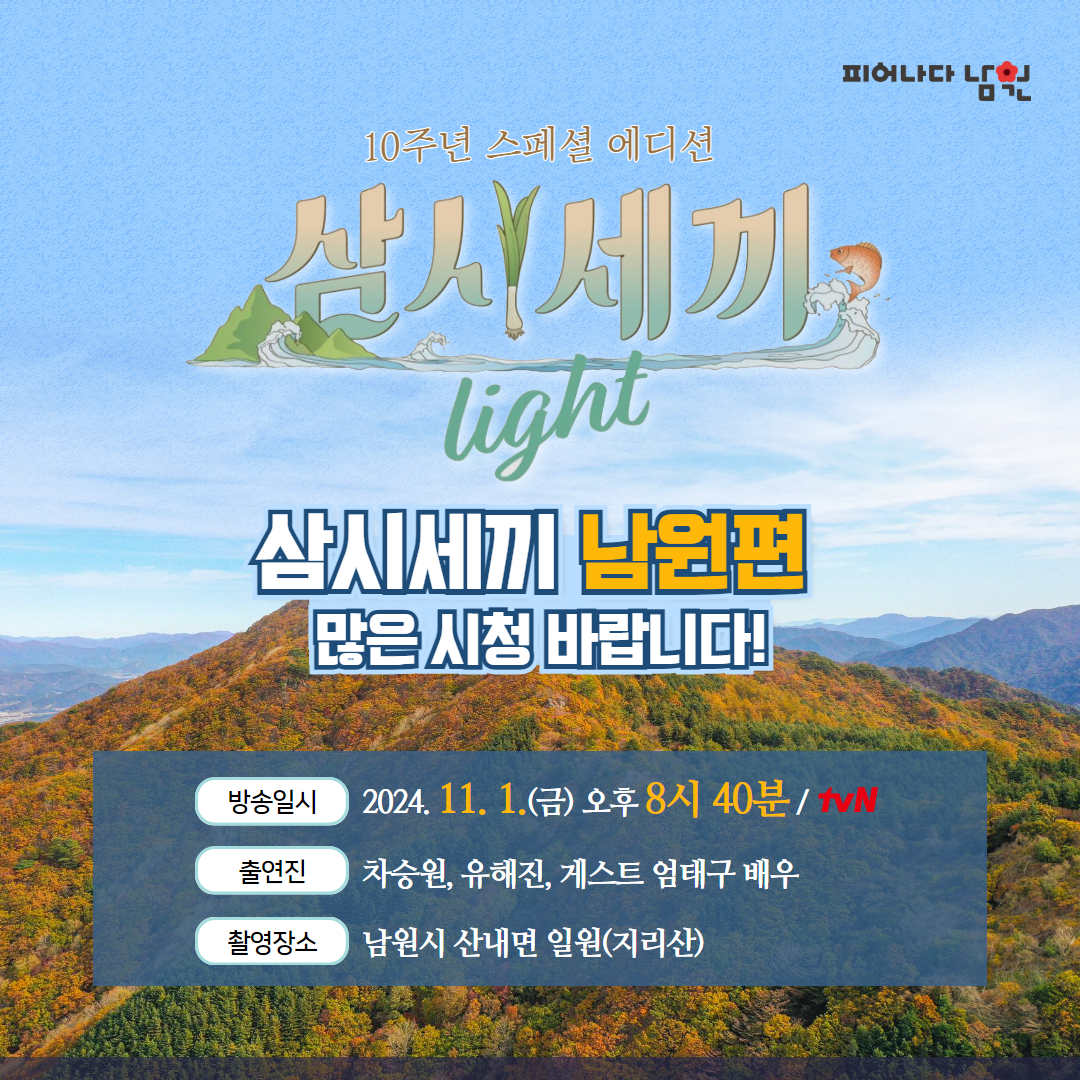 tvN과 나영석 PD의 대표 예능 <삼시세끼>가 10주년 기념 스페셜 에디션으로 돌아옴에 따라 ‘삼시세끼 Light- 지리산편’이 오는 11월 1일(금)