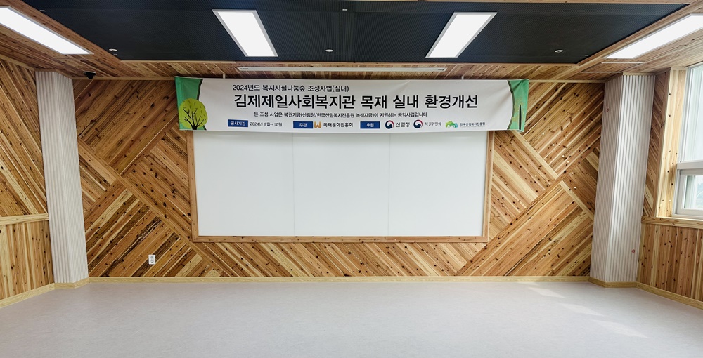 김제제일사회복지관은 복지관 내 강당, 복도, 프로그램실, 휴게실(237㎡) 등에 친환경 목재를 사용하여 천장, 바닥, 벽면을 새롭게 단장해 이용자들이 더욱 쾌적한 환경에서 복지관을 이용할 수 있도록 조성했다.