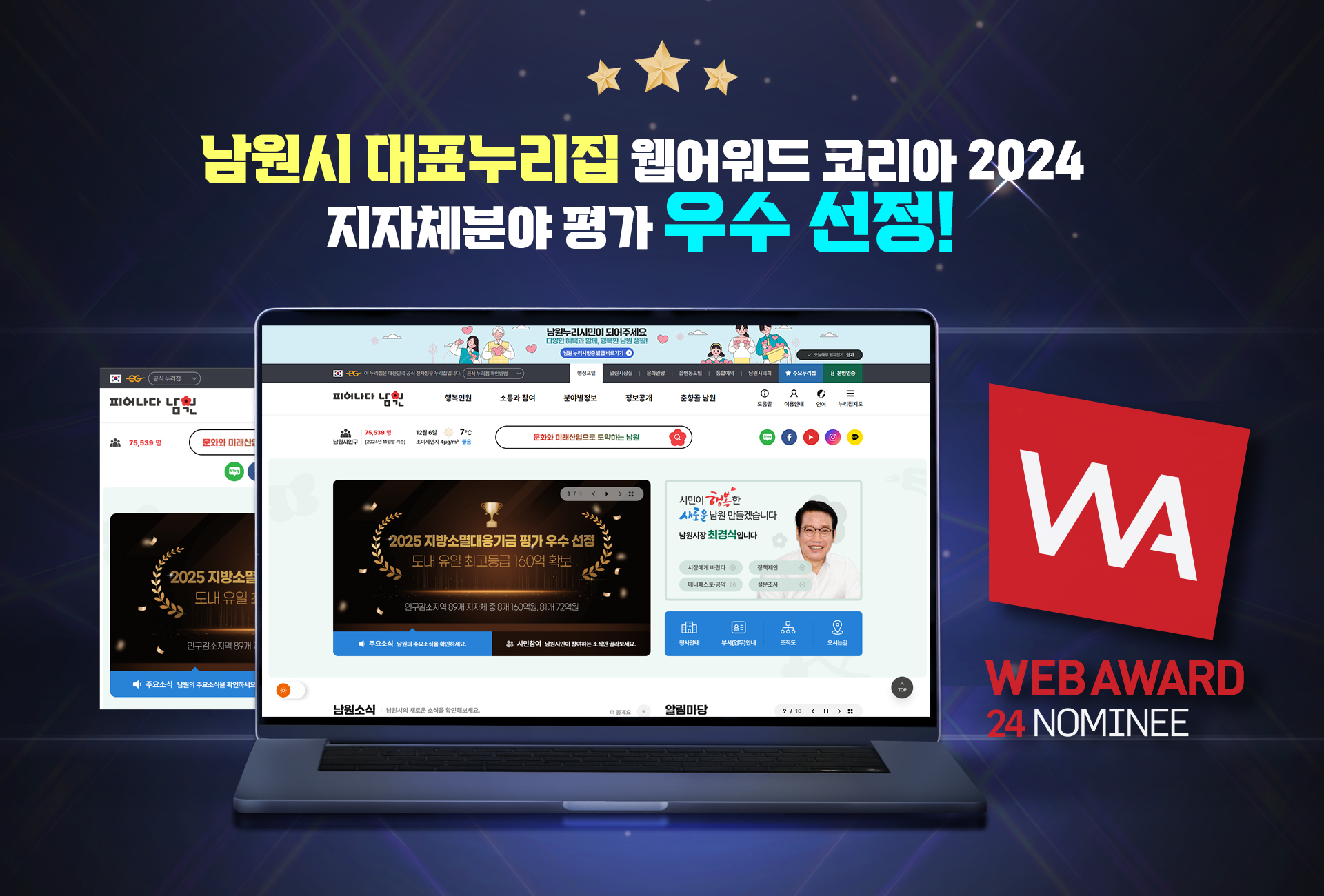 남원시 대표누리집은 디지털 취약계층의 동행과 포용을 위한 모바일 음성인식 검색, 전자점자서비스, 편안하고 시각적 즐거움을 제공하는 다크모드 등 각종 서비스와 기능이 잘 구분되어 있어 사용자에게 편리함을 제공하고 있다. 또한, 지난 11월에는 과학기술정보통신부가 인증한 정보통신접근성(웹) 품질인증 마크를 획득한 바 있다.