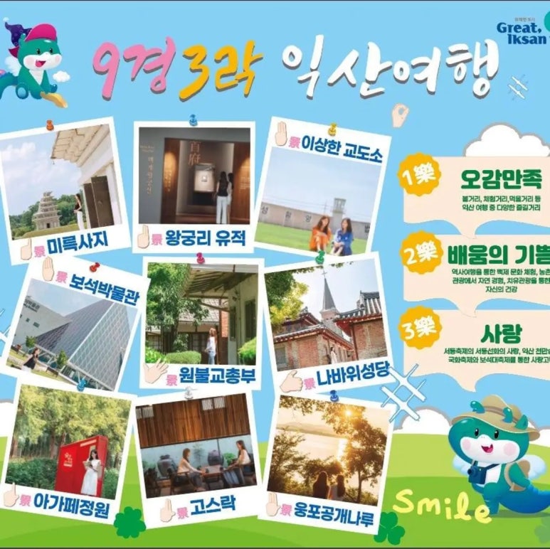 올해 익산시는 한국관광공사 제시한 관광 추세(트렌드) 중 '쉼이 있는 여행'을 주제로 9경 3락을 선정하고 이를 연계해 전 세대를 아우를 수 있는 관광상품을 개발·운영했다.