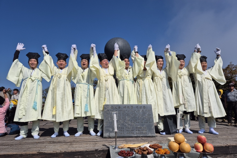 10일 설천면 미천리 민주지산 삼도봉 정상(1176m) 대화합 기념탑에서 열린 행사는 삼도 주민 화합과 공동 발전 계기 마련을 위한 것으로 올해는 무주군이 주최하고 (사)무주문화원이 주관했다.