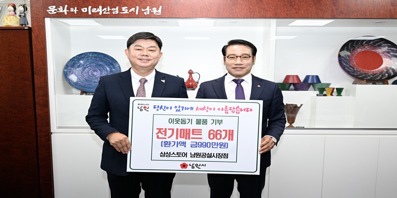 이에 최경식 남원시장은 “지역사회와 상생하며 나눔을 실천해 주신 삼성스토어 남원공설시장점과 김경찬 대표께 진심으로 감사드린다”라며, “기부해 주신 전기장판은 한파 취약계층과 어르신들께 전달되어 큰 힘이 되고 있다. 앞으로도 기업과 지역사회가 함께 어우러지는 따뜻한 남원을 만들어가겠다”라고 전했다.