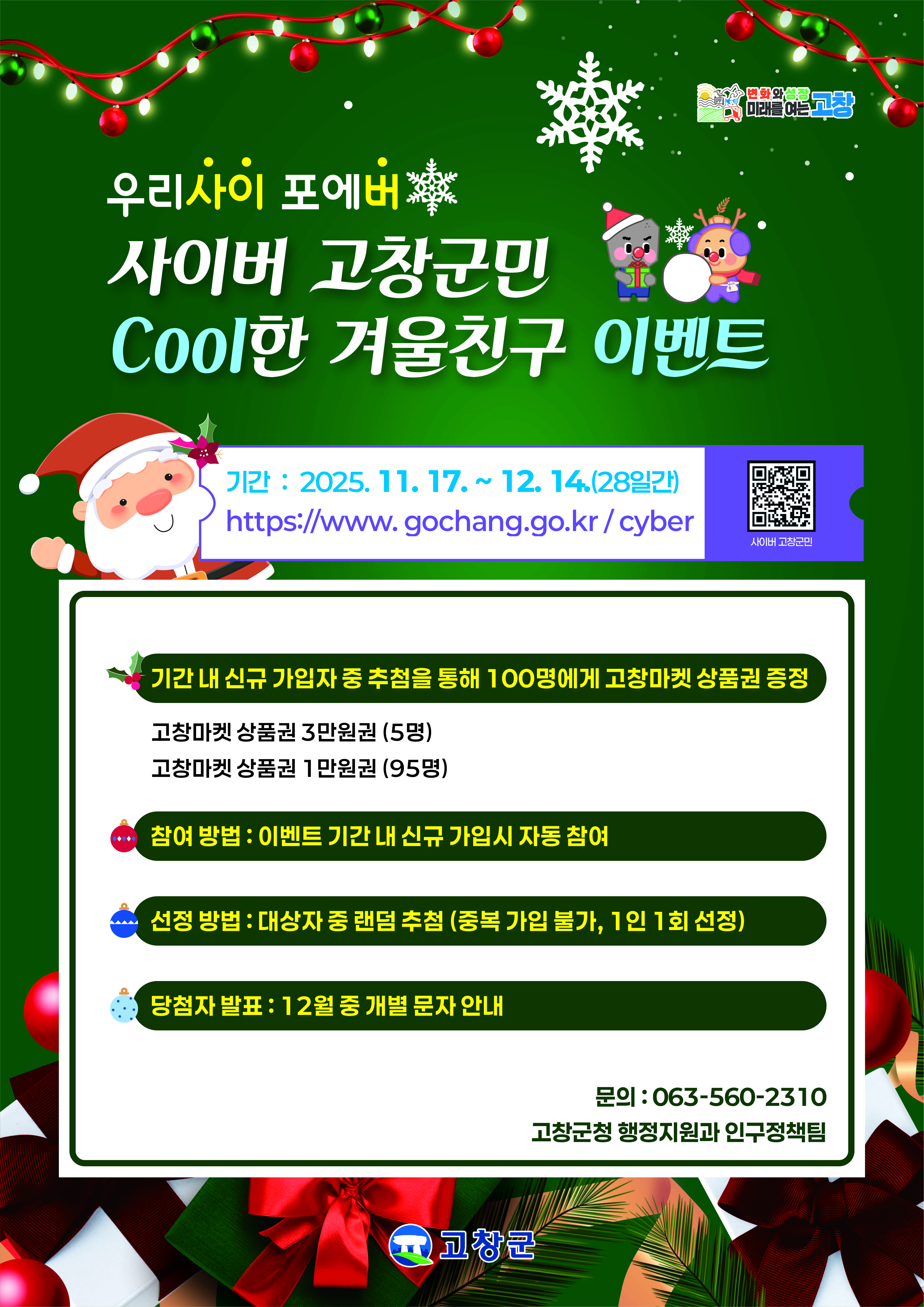 [고창=뉴전북] 고창군이 ‘사이버 고창군민’ 신규가입자를 대상으로 12월14일까지 쿨(Cool)한 겨울친구 이벤트를 진행한다고 밝혔다.