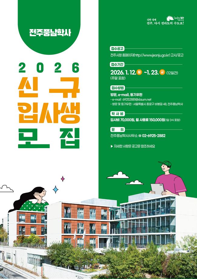 [사회=뉴전북] 인재 양성의 요람인 전주시 서울장학숙 전주풍남학사(소장 최두형)가 2026년도 신규입사생을 모집한다.
