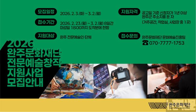[완주=뉴전북] (재)완주문화재단(이사장 유희태)은 2026년 한 해 동안 지역 예술인의 안정적인 창작활동을 지원하기 위해 2026 전문예술창작지원사업에 참여할 예술인 및 예술단체를 모집한다.