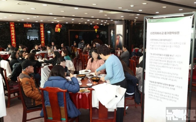 신천지 익산교회 교인들이 설 명절을 맞아 중식당에서 가족과 함께 식사를 하며 담소를 나누고 있다.