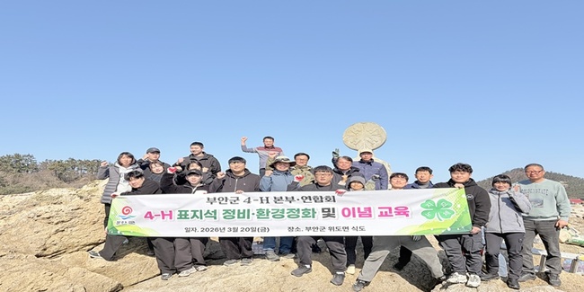 [부안=뉴전북] 부안군 4-H본부(회장 김오철)와 4-H연합회(회장 서정우)는 지난 20일 위도면 식도항 앞바다의 암초인 간단여에 위치한 4-H 표지석을 정비하고 주변 환경정화 활동 및 이념 교육을 실시했다고 밝혔다.
