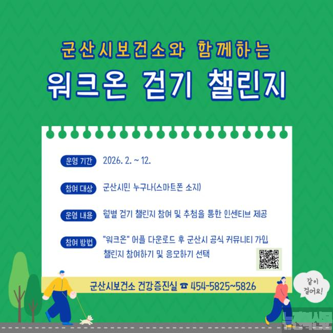 [의학·건강=뉴전북] 군산시보건소(소장 문다해)가 모바일 걷기 앱 ‘워크온(WalkOn)’을 활용한 월별 걷기 챌린지를 2월부터 12월까지 운영할 예정이라고 밝혔다.