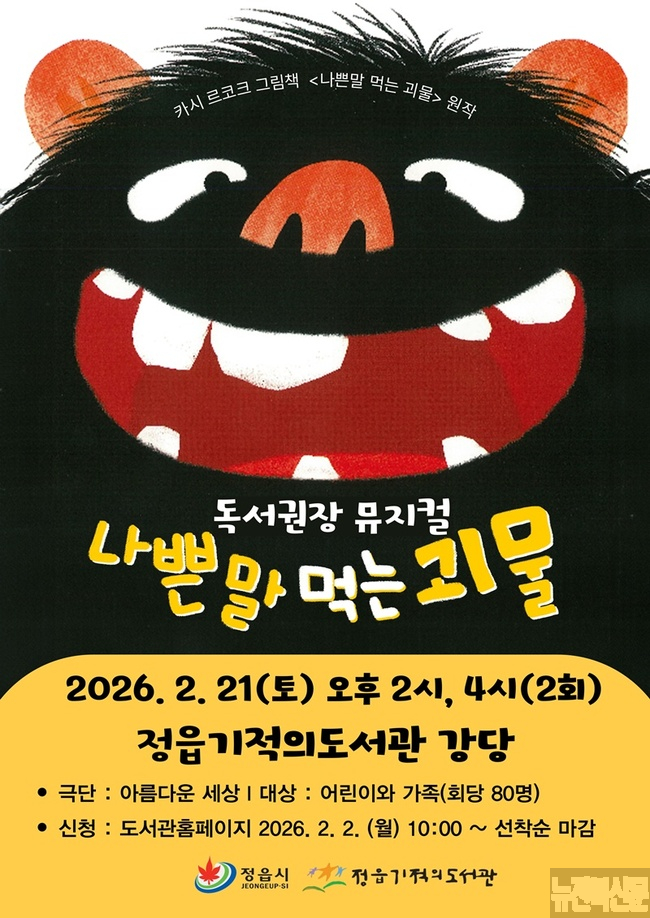 [문화·체육=뉴전북] 정읍기적의도서관은 겨울방학을 맞이해 어린이와 가족이 함께 즐길 수 있는 창작 뮤지컬 ‘나쁜 말 먹는 괴물’을 오는 21일 오후 2시와 4시, 총 2회 공연한다.