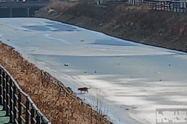1일 오후 얼어붙은 하천 위를 동물이 지나가고 있다.