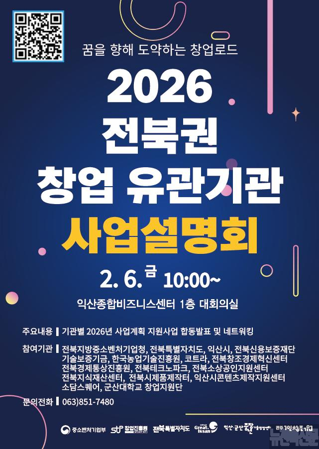 도는 6일 익산시 중장년 기술창업센터에서 중장년 예비 창업자와 초기 창업기업을 대상으로 전북창조경제혁신센터, 전북테크노파크, 기술보증기금 등 지역 내 10여 개 창업 유관기관과 함께 ‘2026년 창업 유관기관 사업설명회’를 개최했다고 밝혔다.