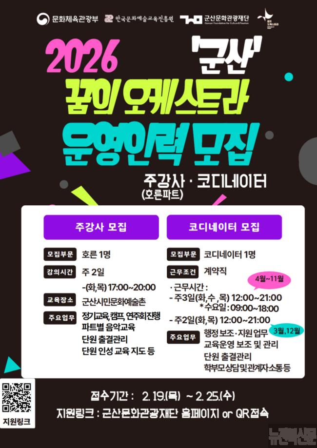 [군산=뉴전북] (재)군산문화관광재단(이사장 강임준)이 ‘2026 꿈의 오케스트라 군산’의 운영인력(주강사․코디네이터)을 25일까지 공개 모집한다.