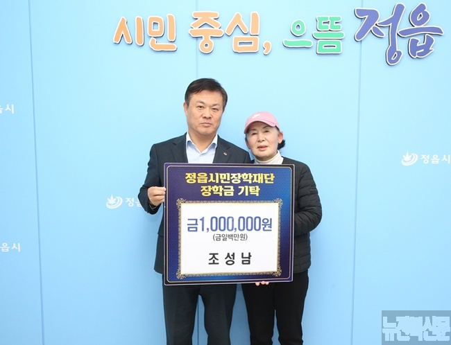 [정읍=뉴전북] 정읍시민장학재단은 지난 19일 시기동에 거주하는 조성남 씨가 지역 인재 양성을 위한 장학금 100만원을 기탁했다고 밝혔다.