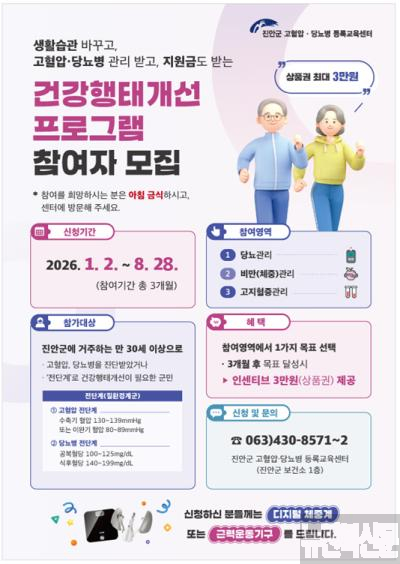 [진안=뉴전북] 진안군 고혈압·당뇨병 등록 교육센터(이하‘센터’)가 고혈압·당뇨병이 있는 주민들의 자가 관리능력을 높이고, 건강한 생활 습관 형성을 돕기 위한 「건강행태 개선프로그램」참여자를 모집한다.
