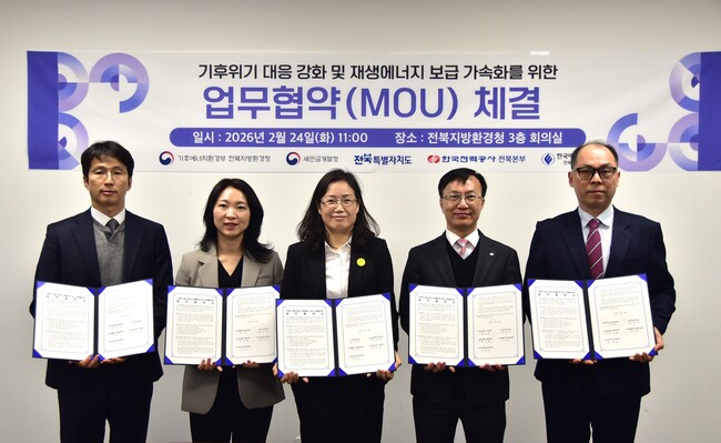 [도정=뉴전북] 전북특별자치도는 24일 전북지방환경청, 새만금개발청, 한국전력공사 전북본부, 한국에너지공단 전북지역본부와 함께 전북지역 재생에너지 보급 가속화를 위한 업무협약(MOU)을 체결하고, 기후위기 대응과 에너지 대전환 실현을 위한 협력에 나섰다.